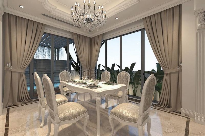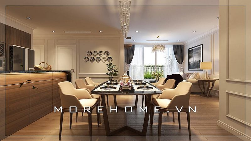 Mẫu bàn ăn tân cổ điển với tông màu kem lạnh là điểm nhấn sang trọng của căn phòng