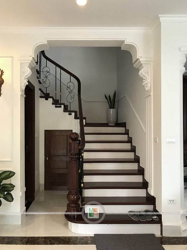 Mẫu cầu thang gỗ óc chó đẹp đẳng cấp tại công trình thi công biệt thự tân cổ điển Ecopark Hưng Yên