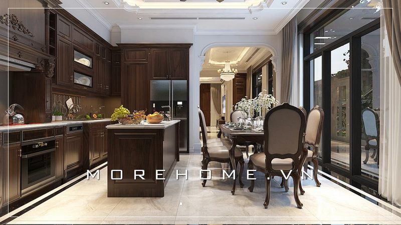 Mẫu tủ bếp tân cổ điển gỗ óc chó đắt tiền đẹp cho không gian nội thất phòng bếp biệt thự Vinhomes Greenbay Hà Nội