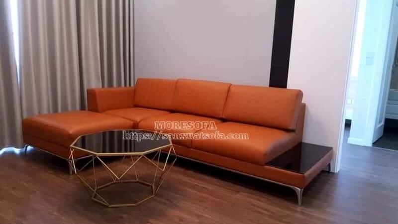 Sofa L hiện đại bọc da cao cấp màu nâu đỏ nổi bật MS-023 kết hợp chân inox và tab trang trí bằng kính sơn đen độc đáo