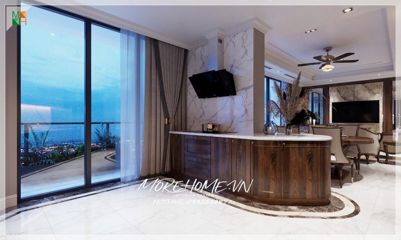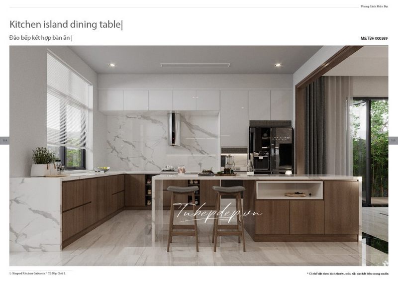 Gợi ý mẫu đảo bếp ốp tường gỗ tự nhiên mặt đá trắng vân mây cho chung cư, nhà phố, biệt thự phong cách tân cổ điển
