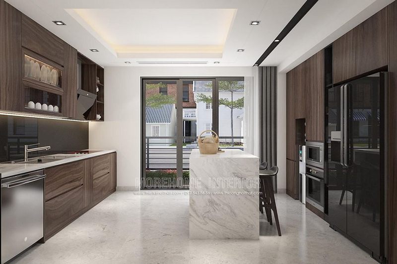 Mẫu thiết kế phòng bếp hiện đại trẻ trung được sử dụng nhiều đá trắng vân mây để ốp bàn, tường bếp. Bàn đảo là điểm nhấn thú vị không thể bỏ qua của phòng bếp này.