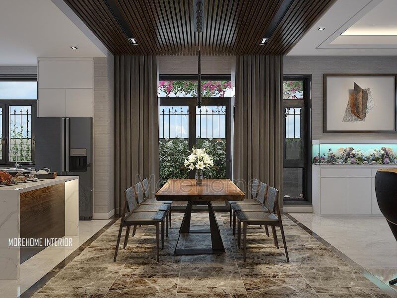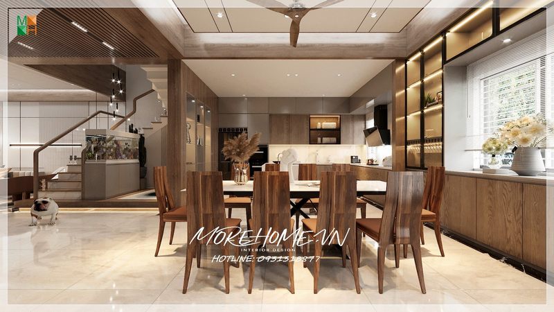 Phòng ăn nơi thưởng thức những món ăn sau một ngày làm việc cùng với người thân nên việc sắp xếp nội thất và bố trí để đem lại sự hợp lí tiện nghi nhất.