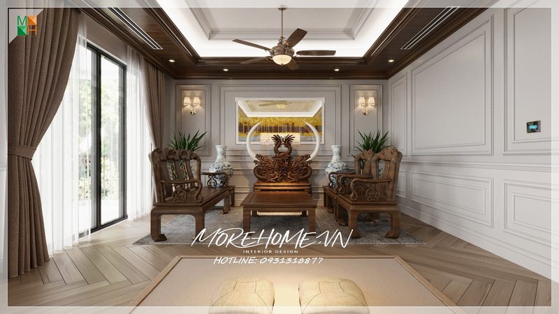 Bộ bàn ghế gỗ óc chó màu nâu trầm tạo nên một không gian sang trọng và ấm áp, cùng với đó là sự thẩm mỹ cao cho căn phòng.