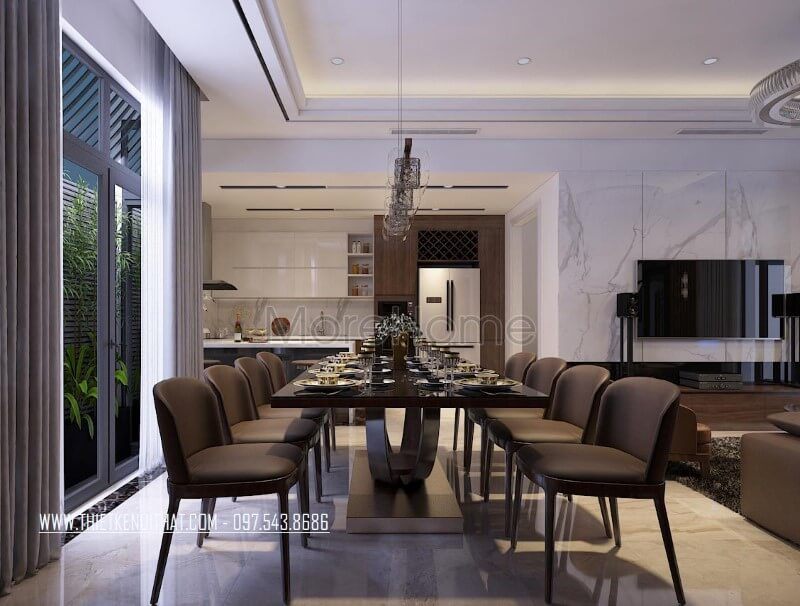 Mẫu bàn ghế ăn dài hiện đại với thiết kế khung gỗ cao cấp, ốp làm bằng da lì màu đen, và vách bàn ăn được thiết kế độc đáo, mang lại cảm giác ấm cúng cho không gian gia đình.