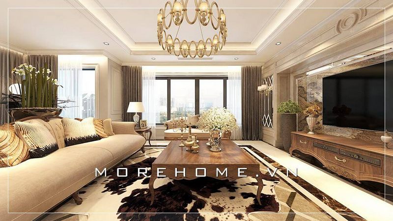 Phòng khách chung cư ấn tượng và nổi bật hơn với chiếc kệ ti vi cao cấp tạo nên sự hòa hảo cho không gian tiếp khách