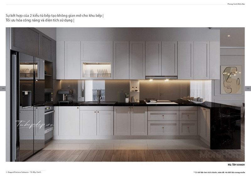 . Mẫu tủ bếp mới và độc đáo, trẻ trung được thiết kế để phù hợp với các căn biệt thự, nhà phố hiện đại cung cấp sự tiện nghi và sự sang trọng. Đá ốp bếp được sử dụng rộng rãi trên một phần tường lớn giúp tạo nên một vẻ đẹp bền vững qua thời gian.