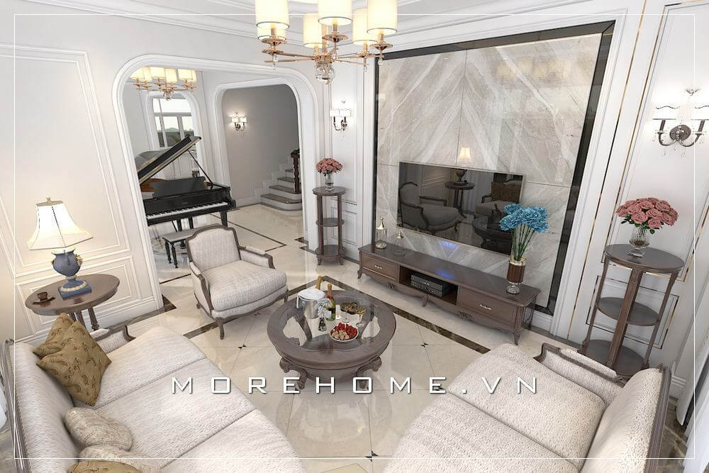 Thiết kế nội thất phòng khách biệt thự, nhà phố với tone màu trắng hiện đại và đồ nội thất thiết kế sang trọng, đẹp mắt tinh tế